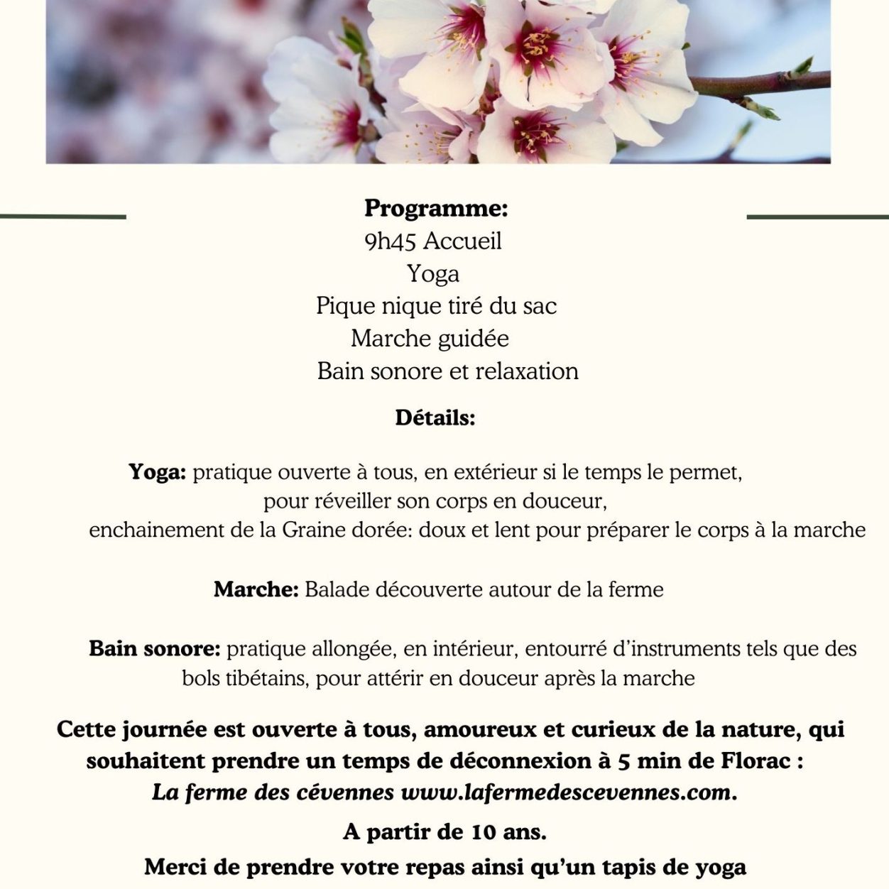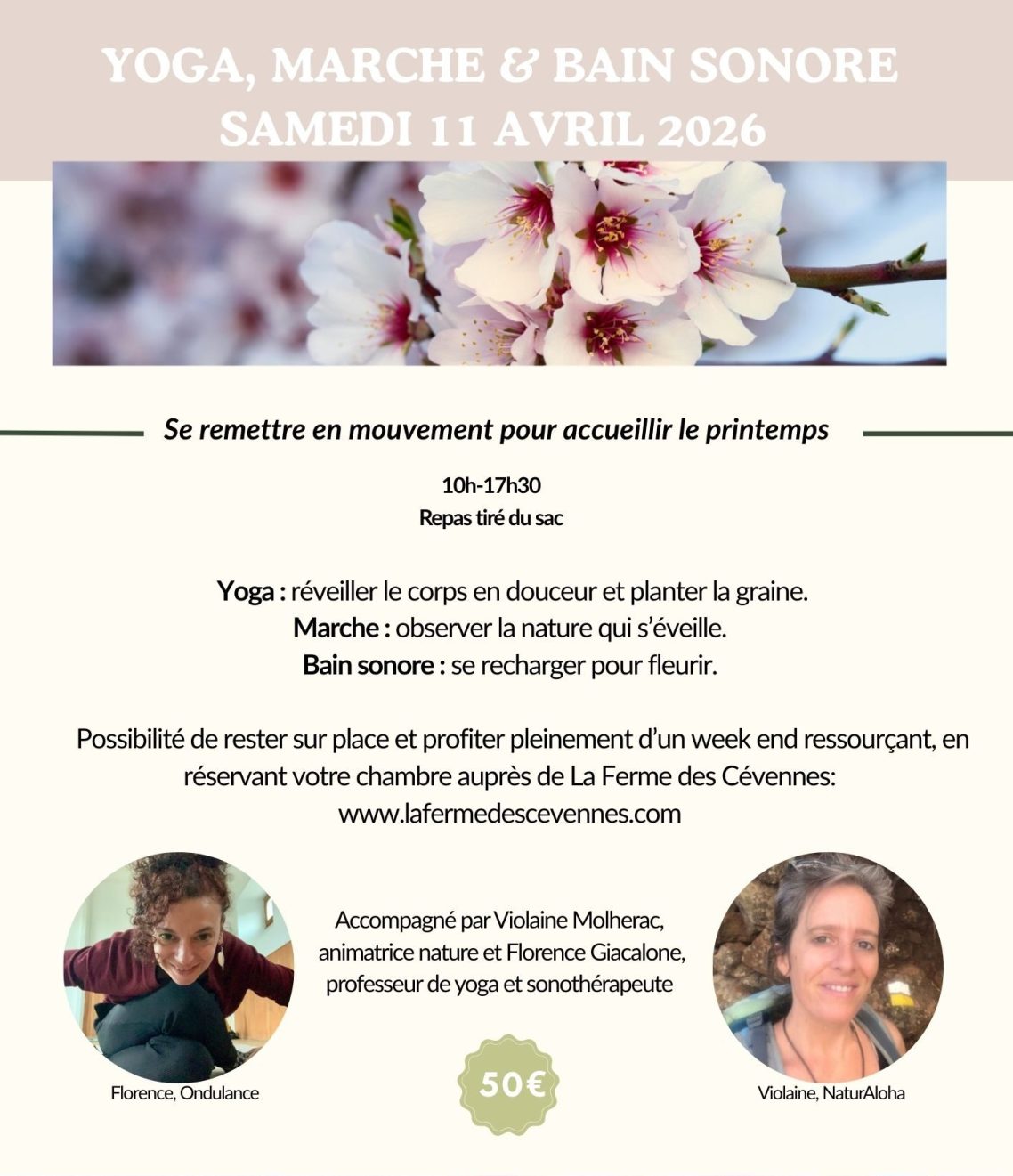 Samedi 11 avril à 10h : Journée Marche Yoga et Bain Sonore avec Florence Giacalone, à La Ferme des Cévennes (5min de Florac) Voir détail en bas de page.